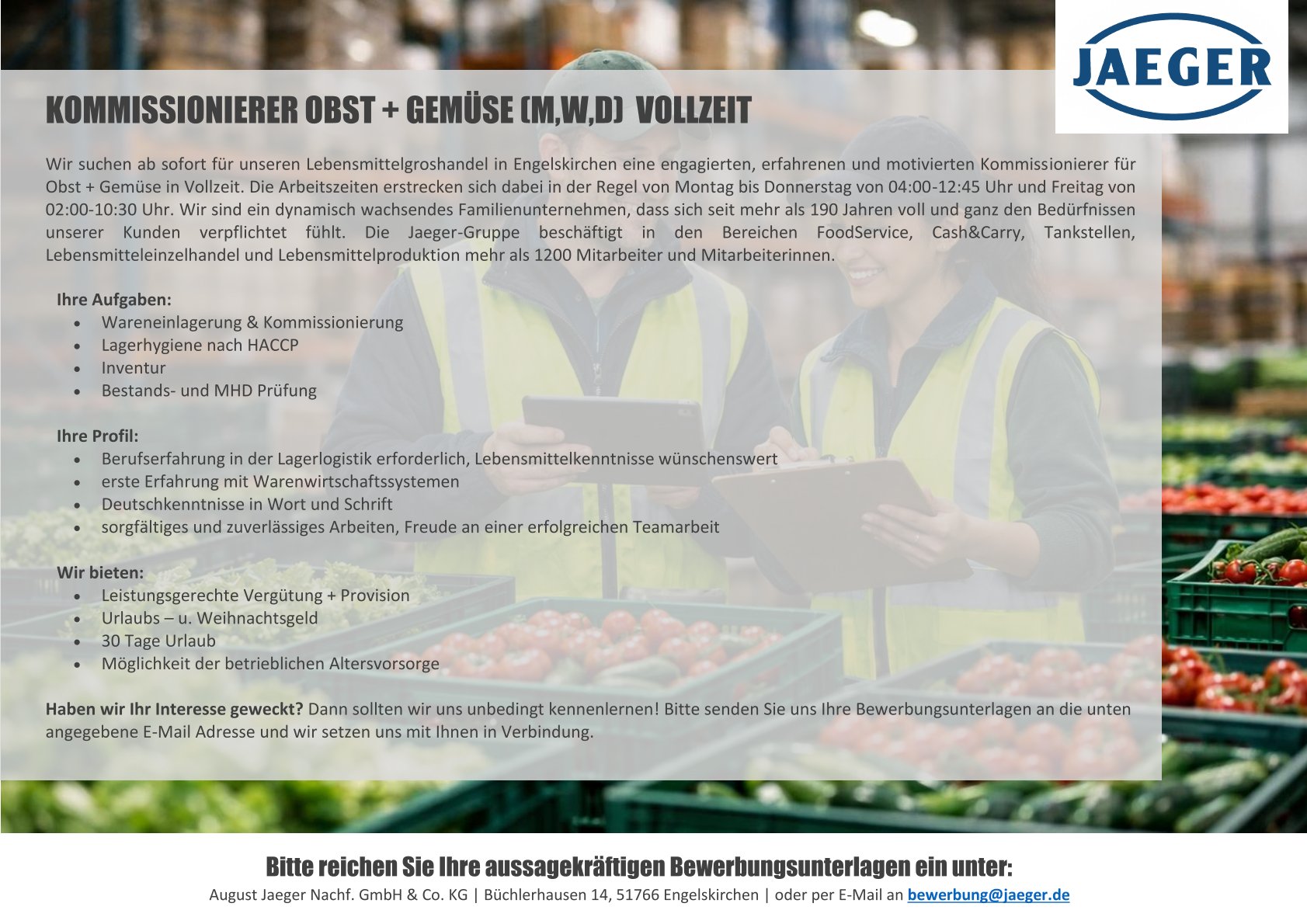 Wir suchen ab sofort für unseren Lebensmittelgroßhandel in Engelskirchen eine engagierten, erfahrenen und motivierten Kommissionierer für Obst + Gemüse in Vollzeit. Die...