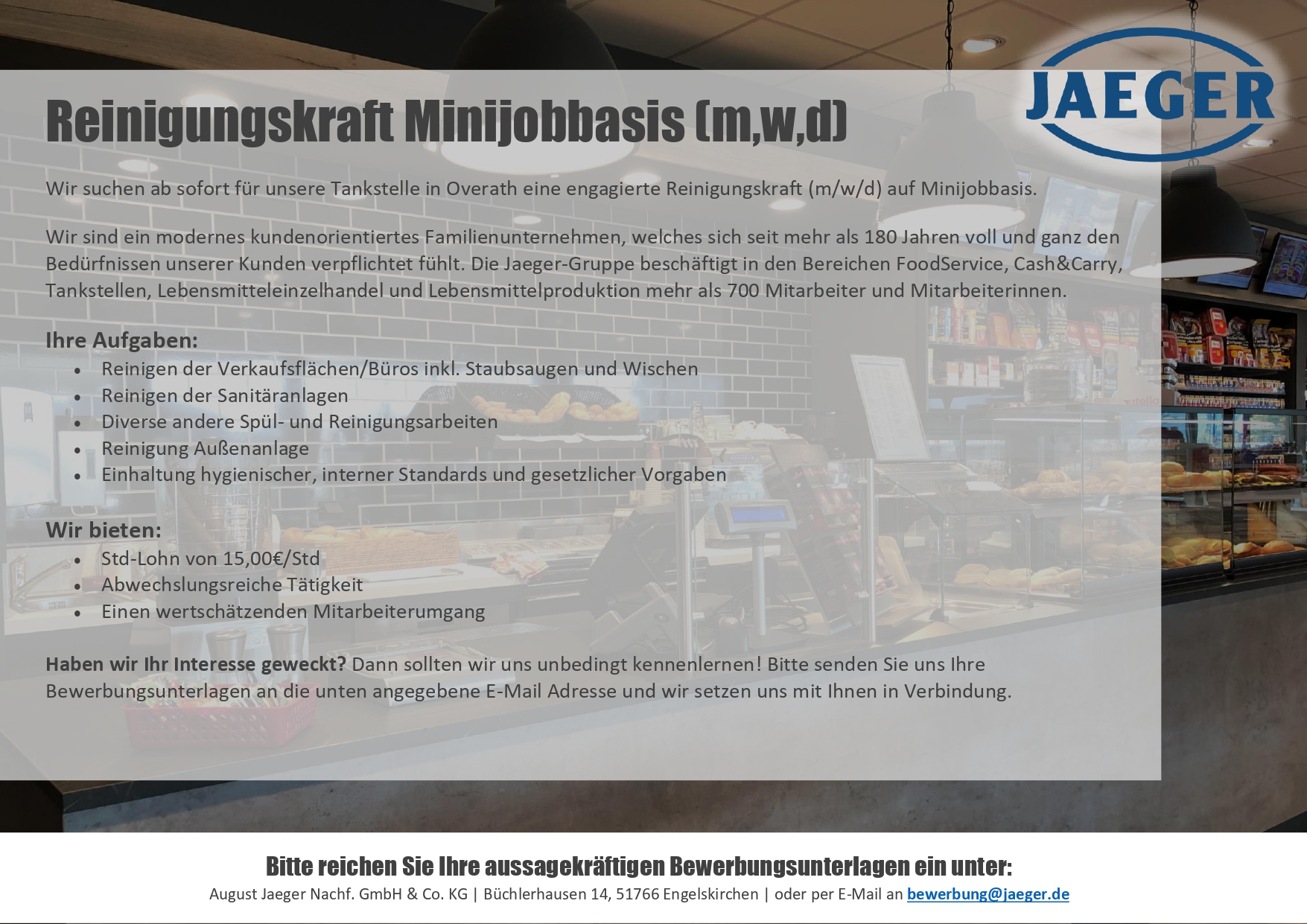 Die Jaeger-Gruppe beschäftigt in den Bereichen FoodService, Cash&Carry, Tankstellen, Lebensmitteleinzelhandel und Lebensmittelproduktion mehr als 700 Mitarbeiterinnen und Mitarbeiter. Hier finden Sie unsere aktuellen Stellenangebote. Oder schicken Sie uns einfach eine Initiativbewerbung.